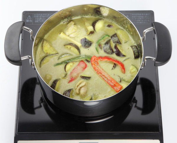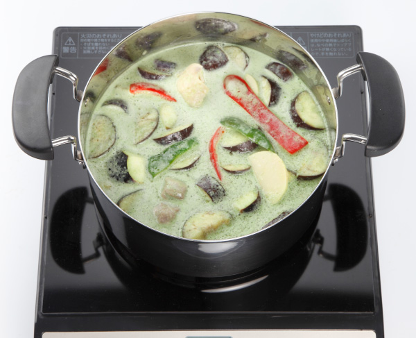 4へココナッツミルクを加えて具材となじませながら加熱し、更に3のペーストを加え煮る。