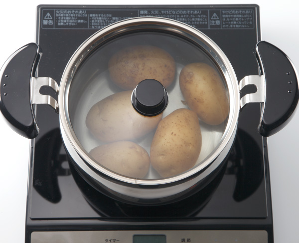 ジャガイモを洗って皮付きのまま調理鍋に入れ、ジャガイモが隠れるまで水を注ぎ火にかける。