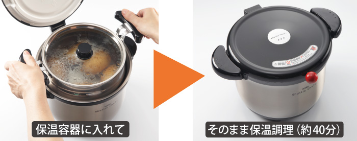 加熱後、火から下ろし保温容器にセットして約40分保温調理する(ジャガイモの大きさにより火の通りが違うので、竹串がスッと通るか確認する。竹串が通りにくいようならば保温調理時間を延長する。)。