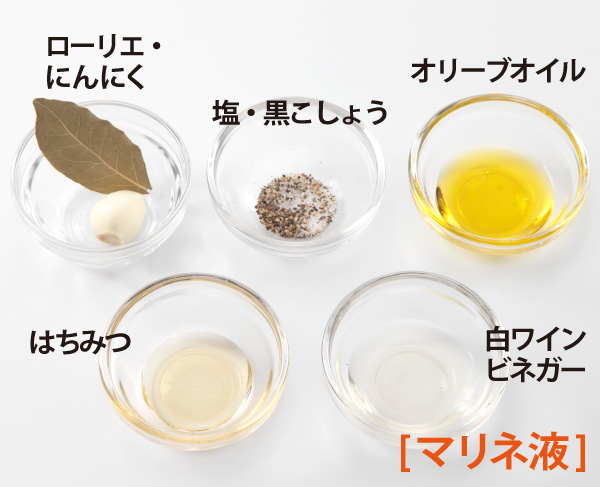 香りを出すために切り込みを入れて軽くつぶしたにんにくと残りのマリネ液の材料を混ぜ合わせる。