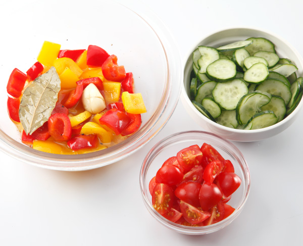 1.5cm程の角切りにしたパプリカにマリネ液を合わせ、電子レンジで約2分加熱する。粗熱がとれたら冷蔵庫で冷やしておく。
