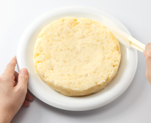 皿にポテトサラダをサークルになるようにへらで形を整えて盛り、高さ2~3cmの土台をつくる。具材がのりやすいよう、土台中央は少しくぼませておく。