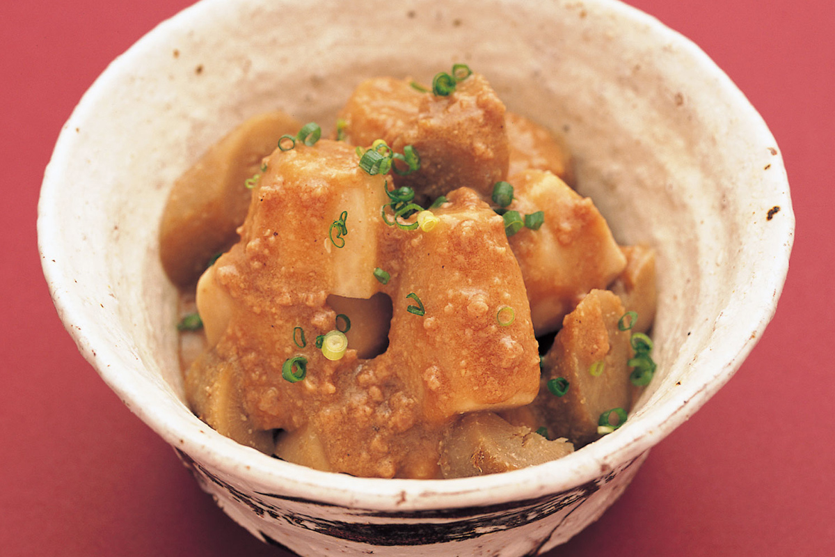 器に3の里いもとごぼうを盛り、4のひき肉あんをかける。