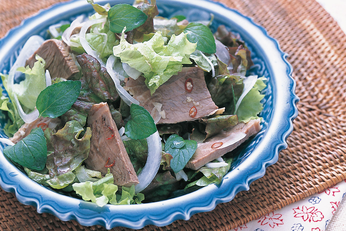 ゆで牛肉、玉ねぎ、サニーレタス、ミントをドレッシングで和える。