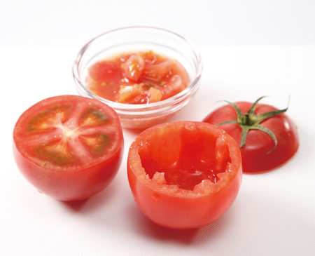 トマトの上部1/4をカットして、中身をスプーンでくり抜いておく(あまり中身を取り除きすぎないのがポイント)。カットした部分はヘタを除き粗みじんにし、くり抜いた中身と合わせてとっておく。