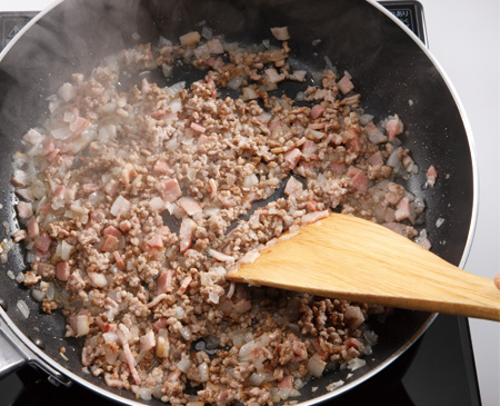 玉ねぎがしんなりしてきたら、無塩バター、豚挽き肉、「材料C」の順に加えさらに炒める。