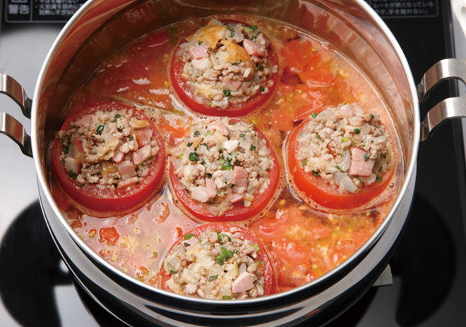 調理鍋に「材料D」と下ごしらえでとっておいたトマトの中身を入れ、挽き肉を詰めたトマトをそっと並べ入れ、火にかける。(煮汁がトマトより1cmくらい下になるようにする)