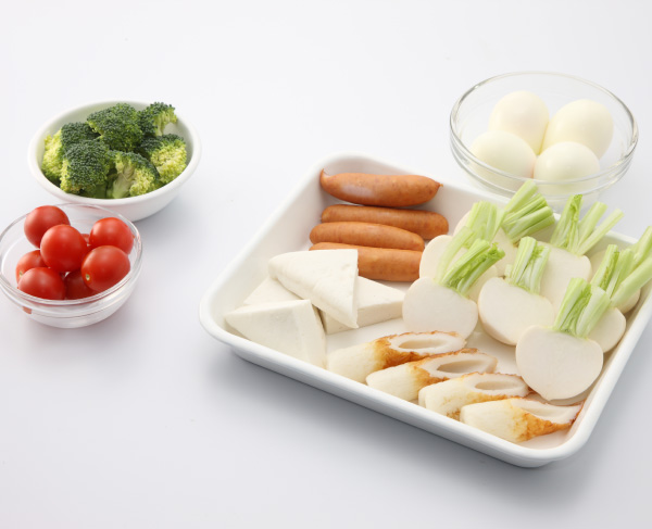 かぶは葉を少し残して切り落とし半分の大きさにに切る。ちくわは1/2に切る。はんぺんは1/4に、ブロッコリーは食べやすい大きさに切っておく。プチトマトはヘタをとっておく。ゆで卵は殻を剥いておく。