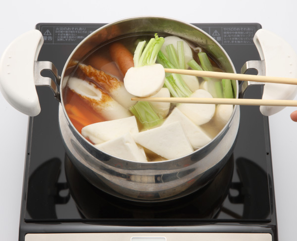 沸とうしたらアクをとり、ソーセージ、ちくわ、はんぺん、かぶ、ゆで卵を入れ、火を弱めてフタをして5分加熱する。