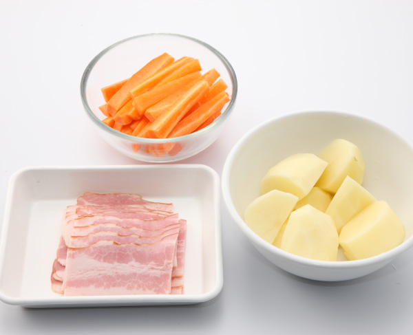 じゃがいも、にんじんは皮をむく。ジャガイモは一口大に切り、にんじんは野菜スティックのように細長く切る。ベーコンは1/3程度に切っておく。