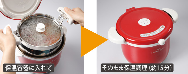 調理鍋を火から下ろし、保温容器にセットして約15分保温する。