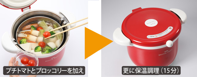 所定時間が経過したら、プチトマトとブロッコリーを加え、更に15分保温調理する。