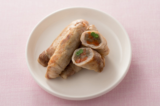 豚肉に塩・こしょうで下味をつけて、1ときんぴらを巻く。