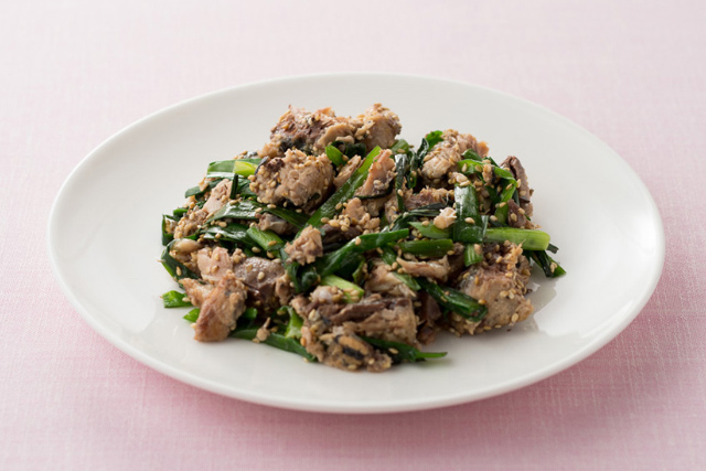 フライパンにごま油を熱し、にらを10秒程度炒める。