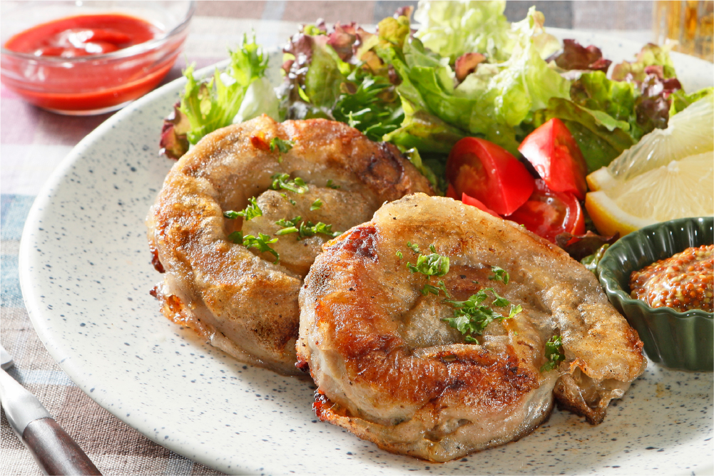 手作りソーセージを気軽に作れるマジックアイテム「ライスペーパー」。フライパンでカリッと焼いて仕上げます。ジューシーでボリュームたっぷりのソーセージでお肉の旨みをお楽しみください。