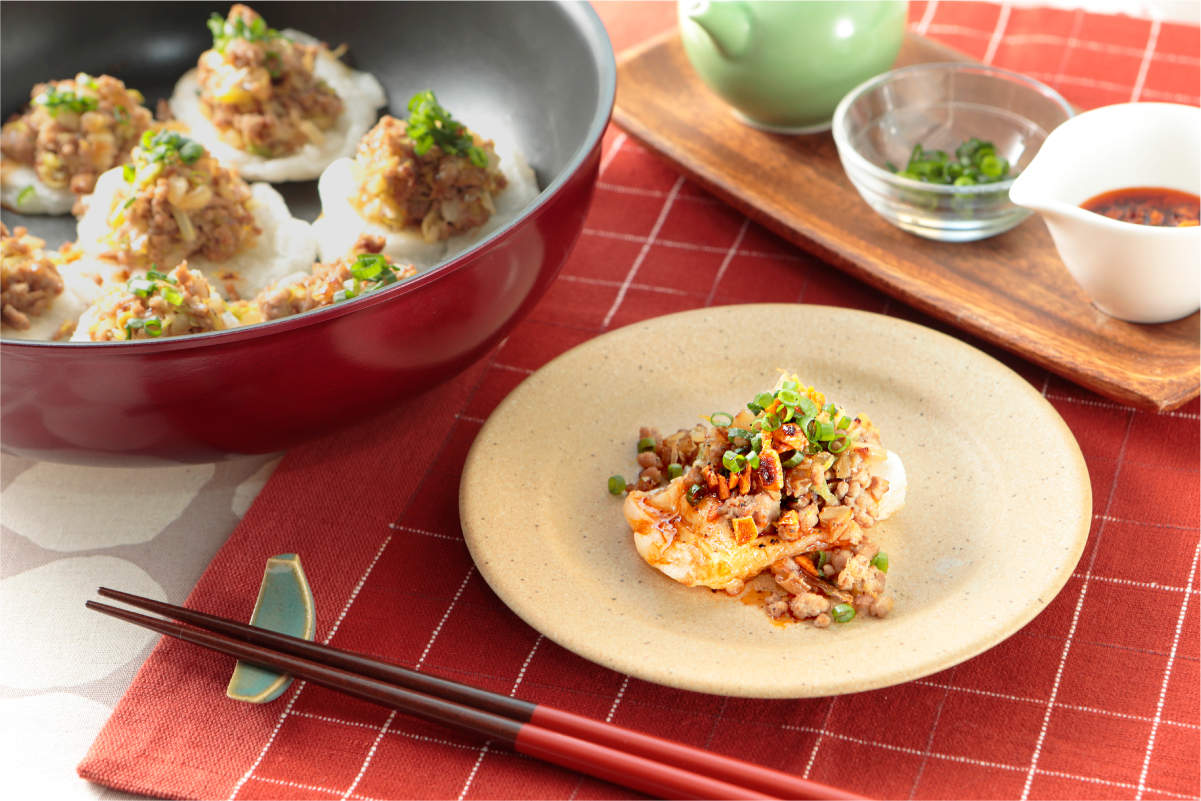 いつもの肉まんをカリッと焼き上げて、ニラとたまごのスープあんをたっぷりかけて召し上がれ。
