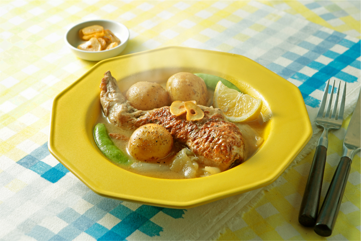 骨付き鶏もも肉の旨みをしっかり感じる、ガーリック&バターの煮込み料理。新じゃが、新玉ねぎ、スナップエンドウなどの春野菜をたっぷり入れて彩り豊かな春の一皿に。白ワインを使用することで香りが立ち、風味が一段とアップします。