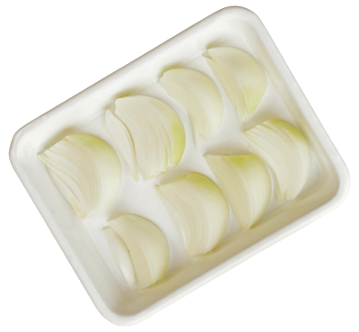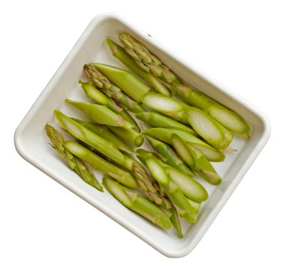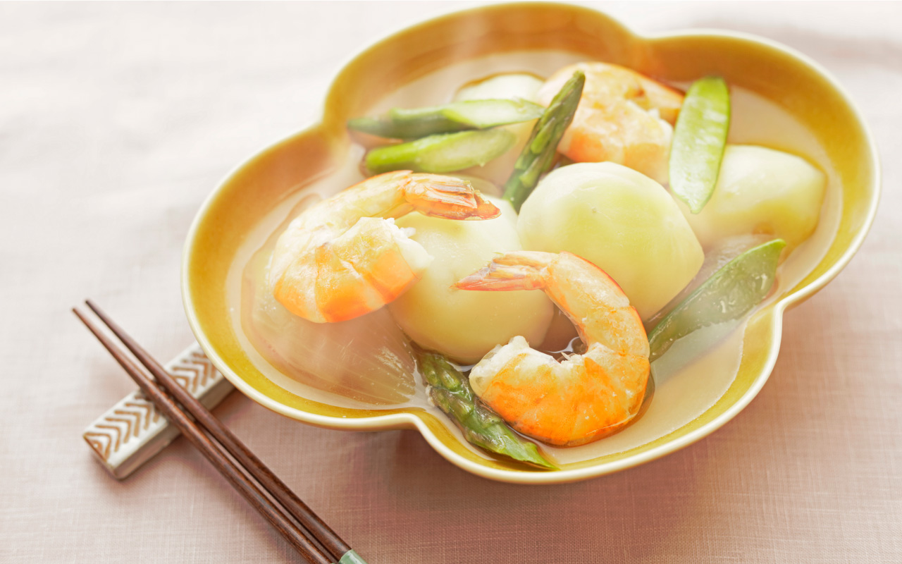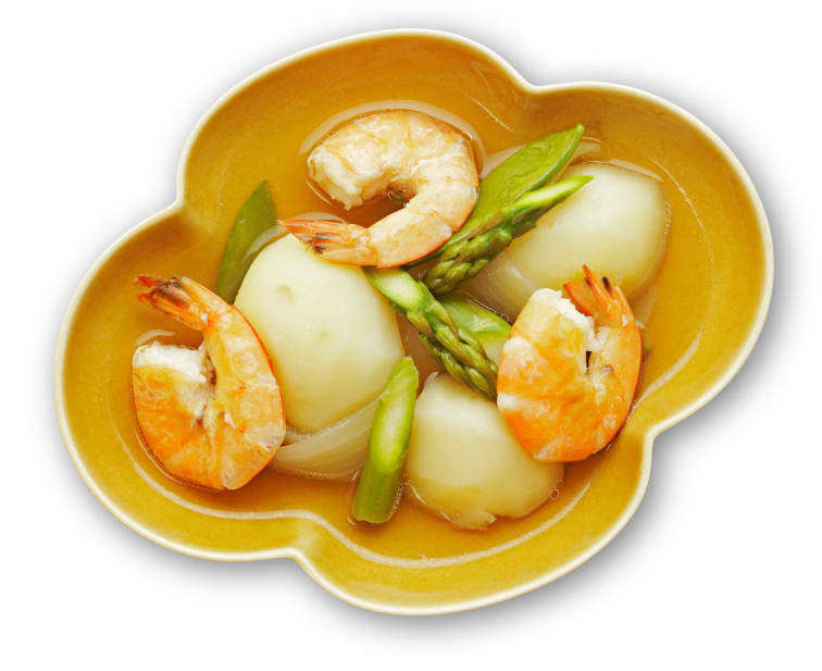 2. じゃがいもは皮をむき、大きめの一口大に切り水にさらす。玉ねぎは8等分のくし型に切る。アスパラガスは根元の固い部分を捨て、薄く根元側の皮を4~5cmほどむき取り、3cmの長さに斜めに切る。さやえんどうは筋をとる。海老は竹串や爪楊枝で背わたをとる。