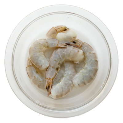 3. 海老は脚を切り尻尾の先を切る。殻付きのまま竹串や爪楊枝で背わたと腹わたをとりボウルに入れる。下処理用の塩と片栗粉を順番に まぶし海老がひたひたになるくらいの水を加え、殻が外れないように気をつけながらもみ洗いをし、汚れが出たら流水で綺麗に洗い流す。 ペーパータオルで水気をとって太白油大さじ1をからめておく。