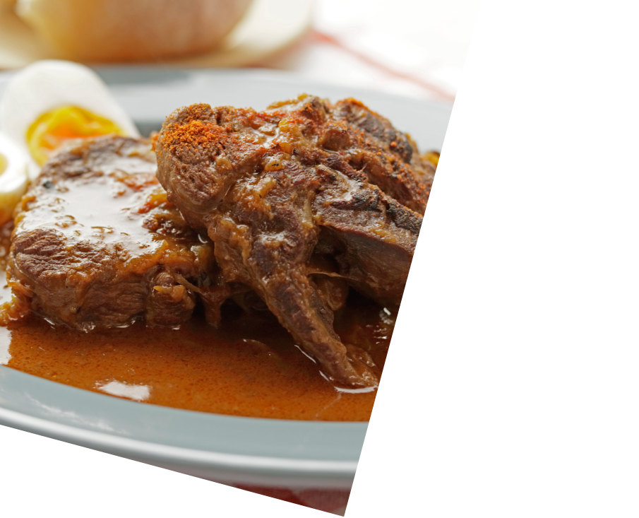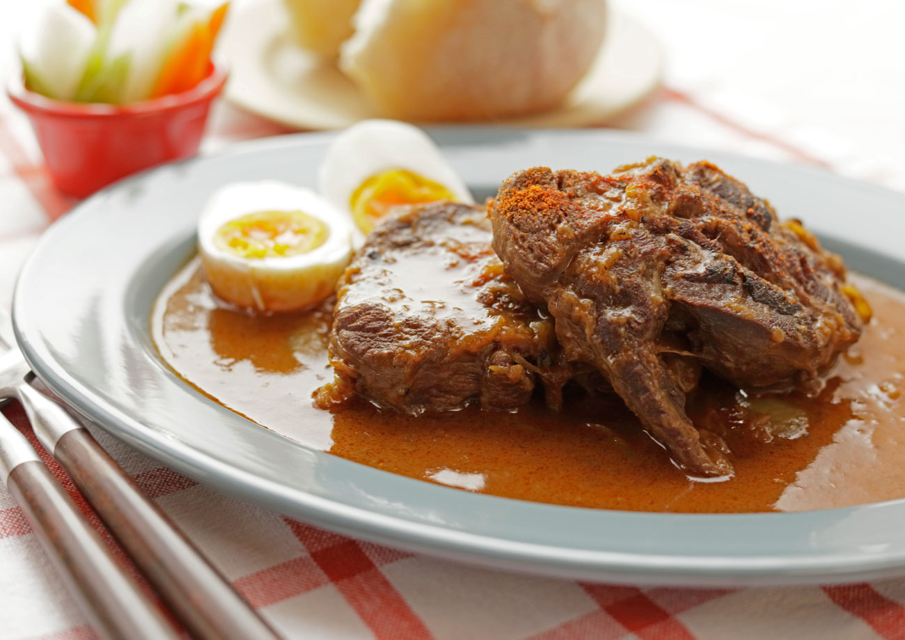 9. 所定の時間が経過したら器に盛り付け、半分に切った半熟ゆで卵を添え、カイエンペッパーをトッピングしたら出来上がり。