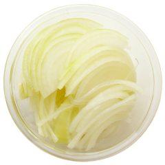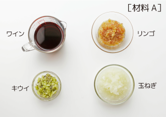 1. 材料Aを準備する。材料Aの玉ねぎとりんごはすりおろす。キウイはみじん切りにする。
