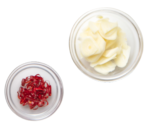 1. 豚肉は一口大に切り、[材料A]で下味をつける。白菜は一口大に切り、セロリは斜め薄切りにする。豆もやしは洗ってざく切り、にんにくは薄切りにする。唐辛子は2本を輪切りにする。しょうがはすりおろす。(チューブのすりおろし生姜でも可能)