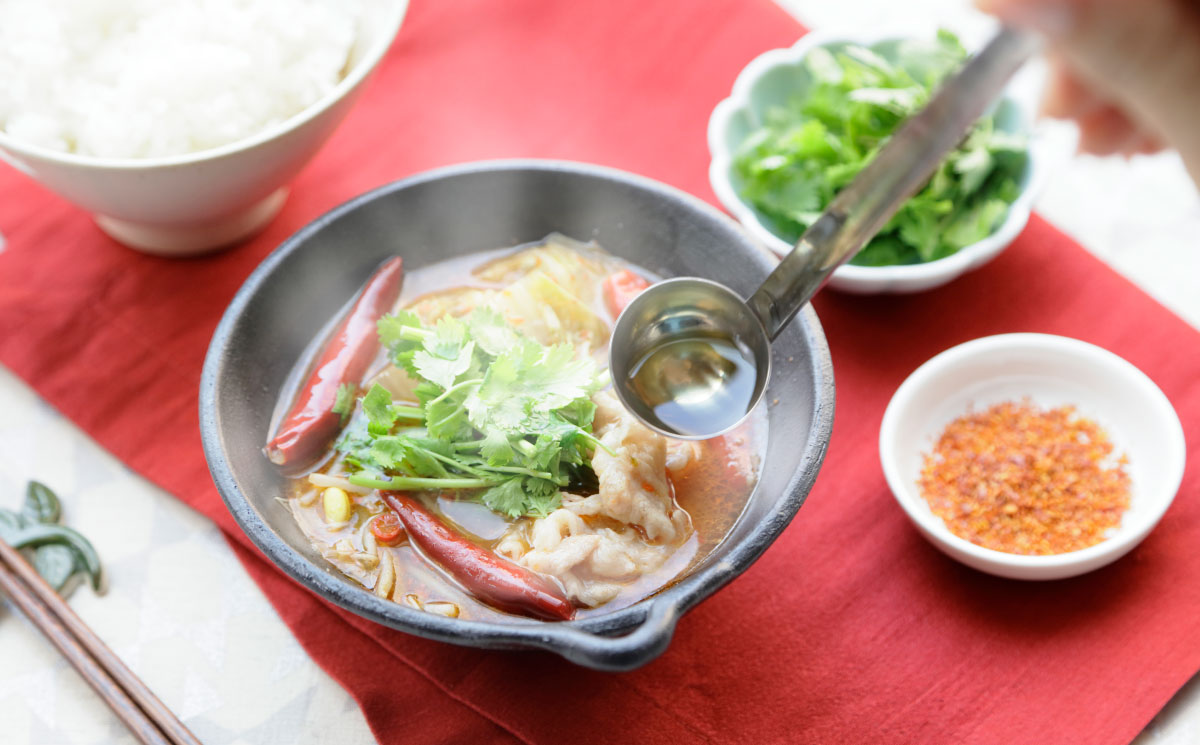 一口大に切った豚肉と白菜をメインに、豆板醤、唐辛子、山椒、ごま油をたっぷり使って煮込む四川の辛い鍋料理「水煮肉片(シュイジューロウピエン)」。