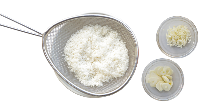 1. 長ネギとセロリはみじん切りにする。にんにくは1片をみじん切りに、残りを薄切りにする。米は研いで水からあげておく。ステーキ肉は常温に戻し