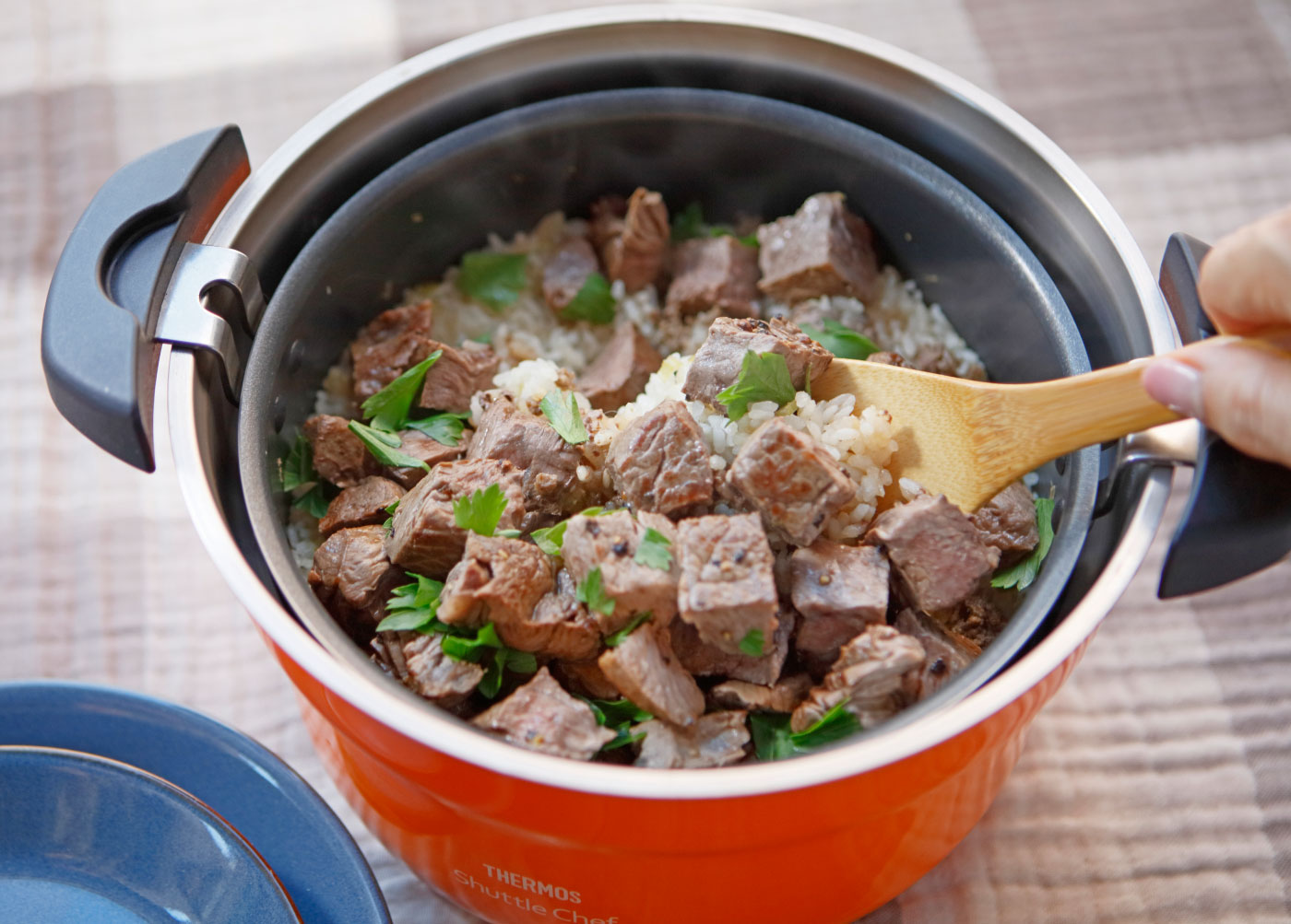 8. ごはんが炊き上がったら、サイコロステーキ(フライパンに残った醤油バターも)と、イタリアンパセリを加えてさらに5分、再保温調理する。