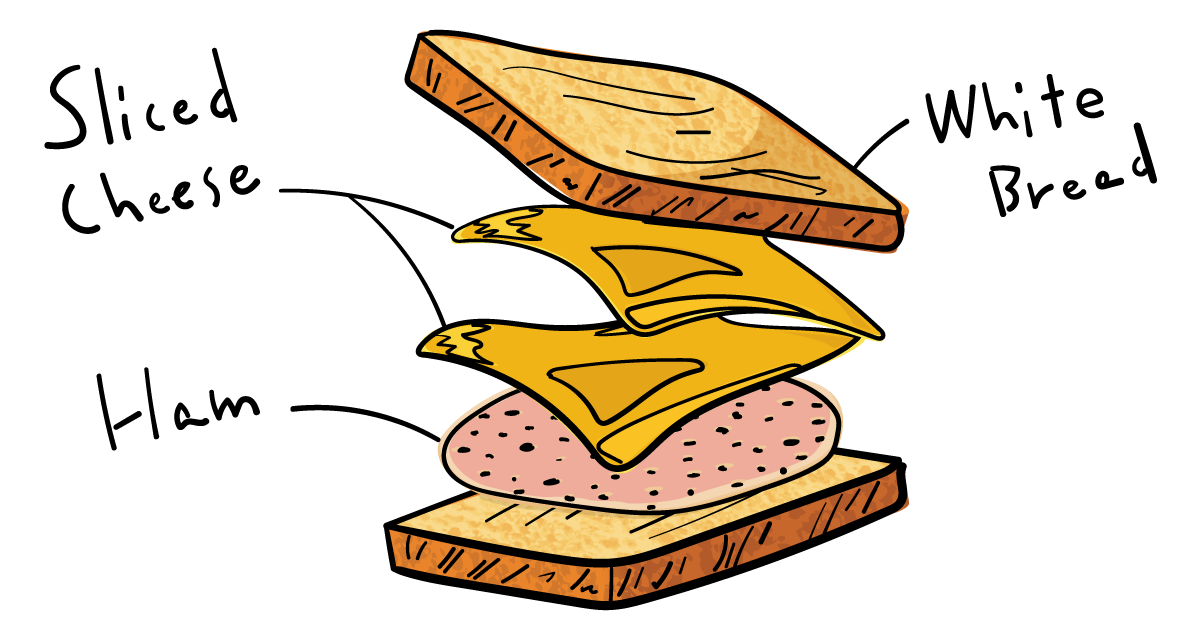 食パンにハムをのせ、黒胡椒をふりかける。その上に2種類のスライスチーズをのせ、さらに食パンをのせてサンドする。2組作る。