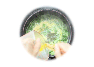 フライパンの取っ手を取り外し食卓へ。ご飯と豆苗たまごスープを器に盛り付けたら出来上がり。