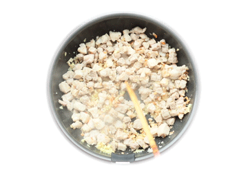 フライパンにごま油をひき、中火で豚バラ肉を炒める。肉に焼き色がついてきたら、余分な油をキッチンペーパーなどで取り除き、火を弱めて、戻した干し椎茸、生姜、にんにく、干しエビ、五香粉を加えて香りがたつまで炒める。