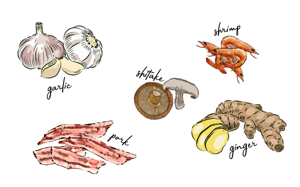 豚バラ肉は1cm角くらいに切る。干し椎茸を水で戻し、戻し汁はとっておき、戻した干し椎茸、生姜、にんにく、干しエビは粗みじん切りにする。チンゲンサイはヘタをきり4等分にして茹でて水分を切っておく。