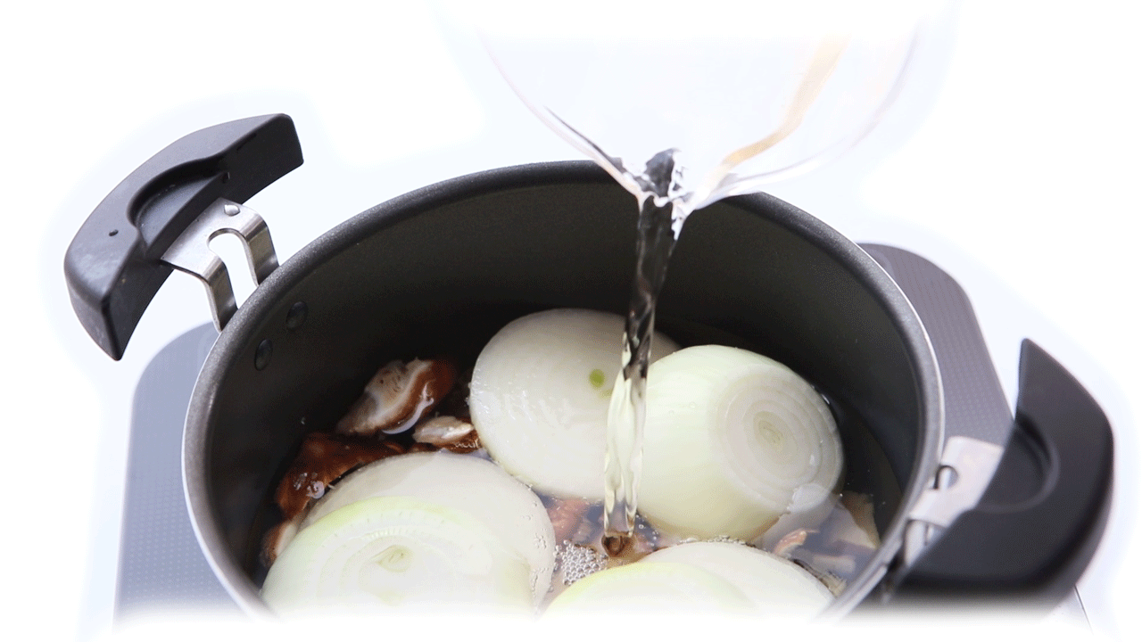 調理鍋に2つ切りにした玉ねぎを並べ、薄切りにした玉ねぎと椎茸、椎茸の戻し汁を加え、フタをして中火にかける。沸とうしたら火をやや弱めて15分程煮る。漬け込んでおいた牛肉と漬け汁を加える。フタをせずに沸とうしたら灰汁を取る。灰汁を取り終えたらフタをして3分加熱し火を止める。
