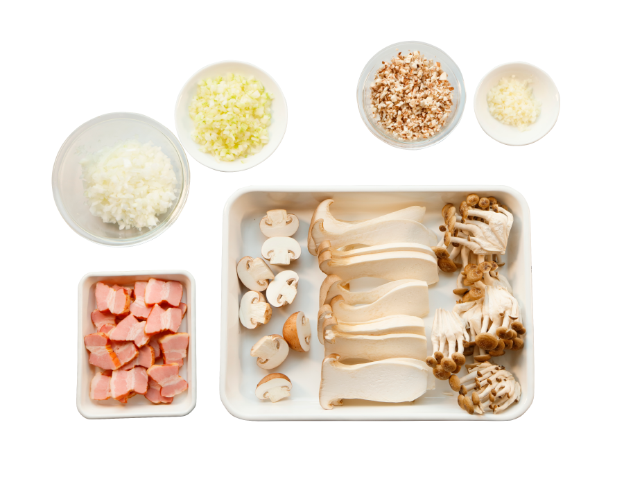 マッシュルームオイル用のマッシュルーム、にんにくをみじん切りにする。クリーム煮用の玉ねぎ、セロリをみじん切りにして、ベーコンは2cmぐらいに切り、エリンギは縦に5mmぐらいの厚さに切る。しめじは大きめにほぐし、マッシュルームは二つに切っておく。