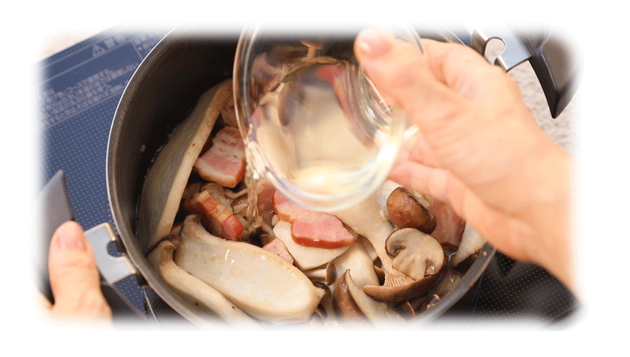 調理鍋にバターを入れ中弱火にかけ、薄切りにしたエリンギを焼き目が付くくらいまで炒めて一度取り出しておく。そのままの鍋に玉ねぎ、セロリ、ベーコンを加えて炒める。べーコンに焼き色が着き始めたら、マッシュルーム、しめじを加えてさらに炒める。きのこ類に焼き色がついてきたら、取り出しておいたエリンギと白ワインを加える。続けて[材料A]を加えてフタをして沸とうしたら火を弱めて5分加熱する。