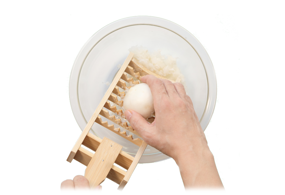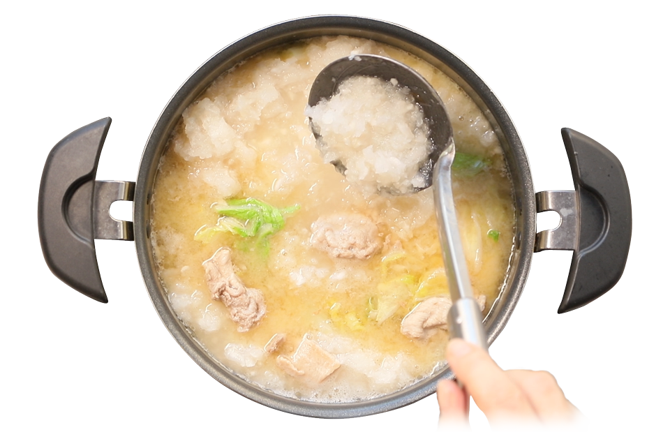 沸とうしたら白味噌を溶かし入れ、すりおろしたカブを加える。一煮立ちしたら2分程加熱して火を止める。