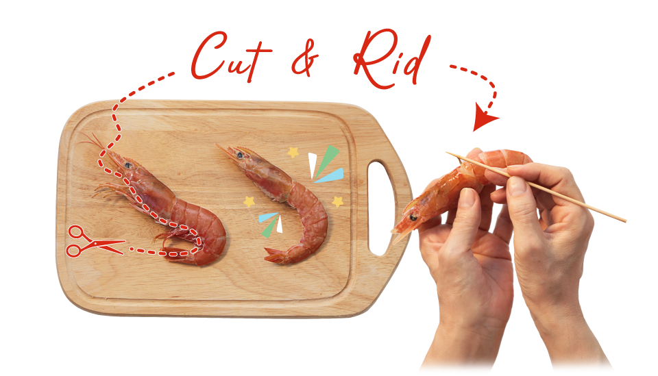 赤海老は、ひげ、脚、尻尾の先を切り、殻付きのまま竹串や爪楊枝で背わたと腹わたをとり、ボウルに入れる。下処理用の片栗粉をまぶし、海老がひたひたになるくらいの水を加えてもみ洗いをし、汚れが出たら流水できれいに洗い流す。ペーパータオルで水気をとっておく。