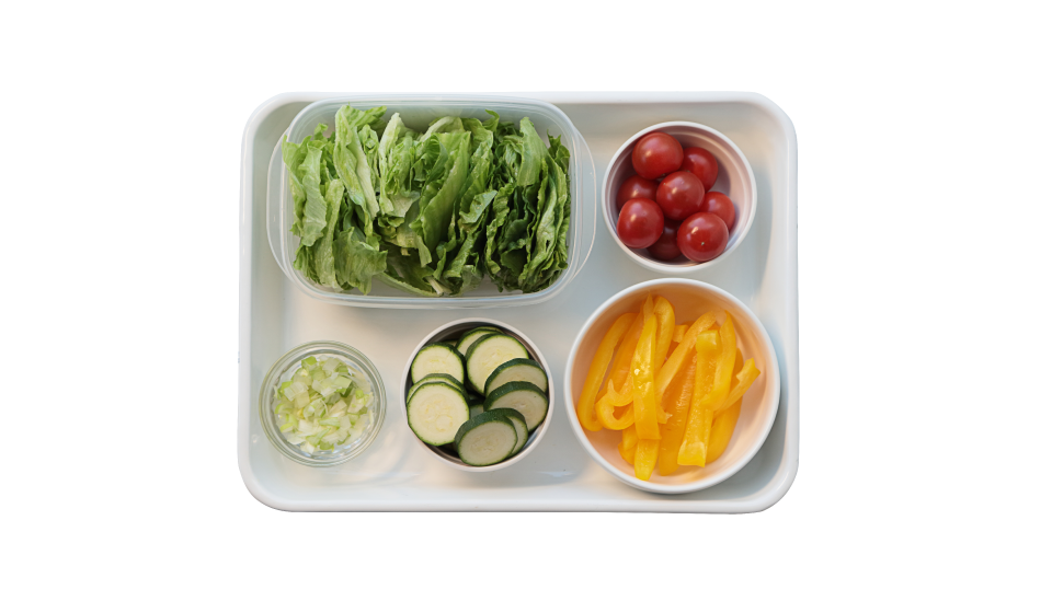 白ネギは粗みじん切り、ズッキーニは5mm幅の薄切り、黄パプリカはへたと種をとり1cm幅に切る。ミニトマトはへたをとり、レタスは芯を取り除いて大きめのざく切りにする。調理鍋で干し海老をから煎りして取っておく。