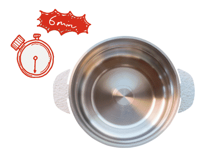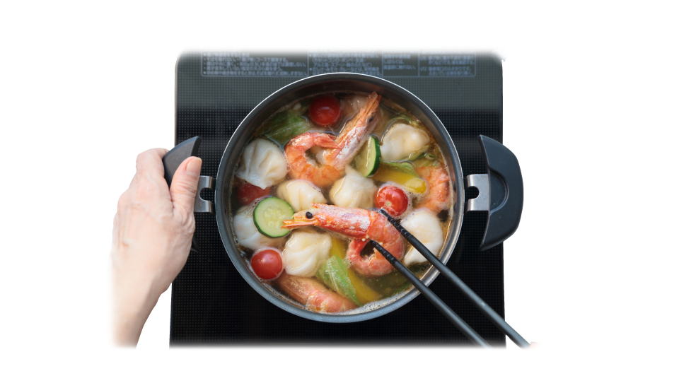 ミニトマト、海老餃子、レタスを加えてひと煮立ちしたら火を止めて、調理鍋を保温容器にセットし6分保温調理する。
