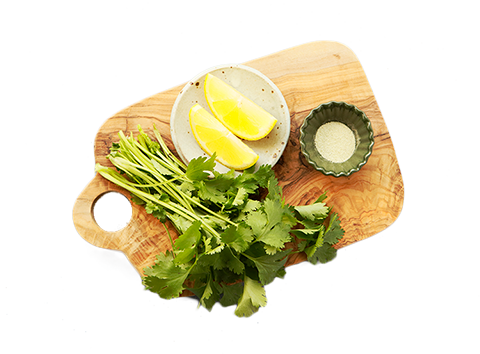 レモン、パクチー、梅昆布茶を添えて出来上がり。