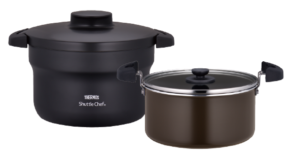 シャトルシェフは、短時間火にかけた調理鍋を保温容器で丸ごと保温し、余熱で食材に火を通す『保温調理』ができる調理器具です。