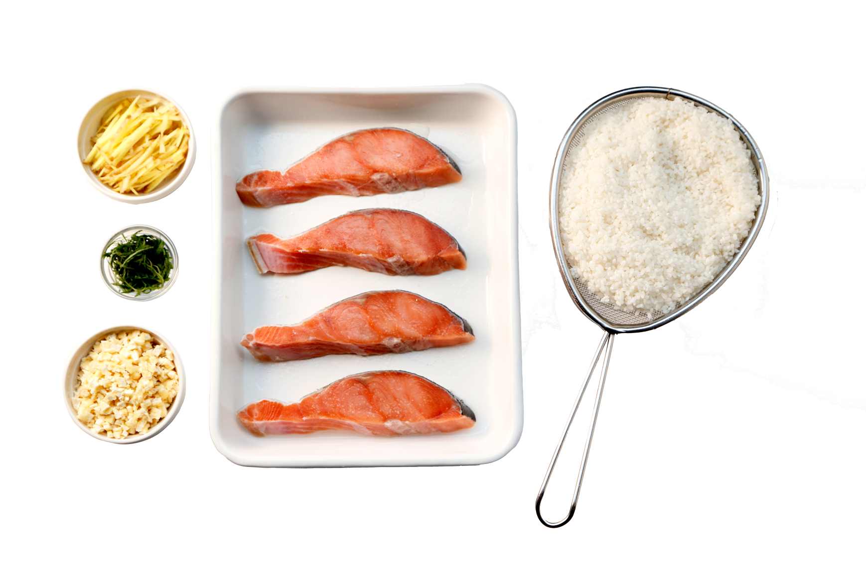 米は洗ってざるにあげておく。大葉は千切りにする。鮭は酒をかけ5分おき、水気をキッチンペーパーで拭き取る。油揚げは油抜きをしてみじん切りに、生姜は千切りにする。
