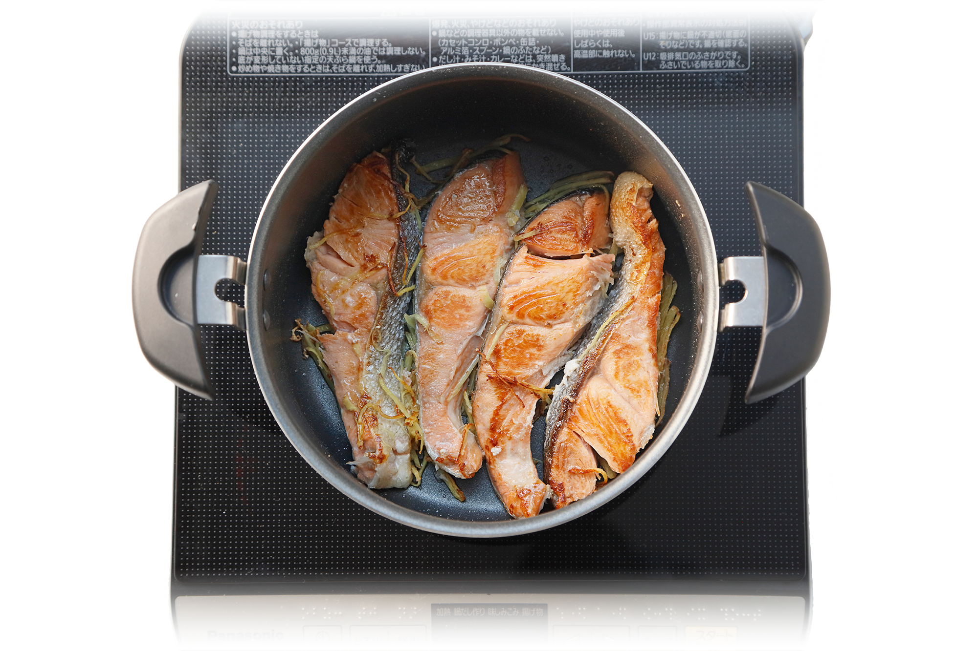 調理鍋に太白油を入れて中火にかけ、鮭を皮目を下にして千切り生姜と一緒に焼く。両面に焼き色がつくまで焼き、火を止めたら鮭を一旦取り出しておく。