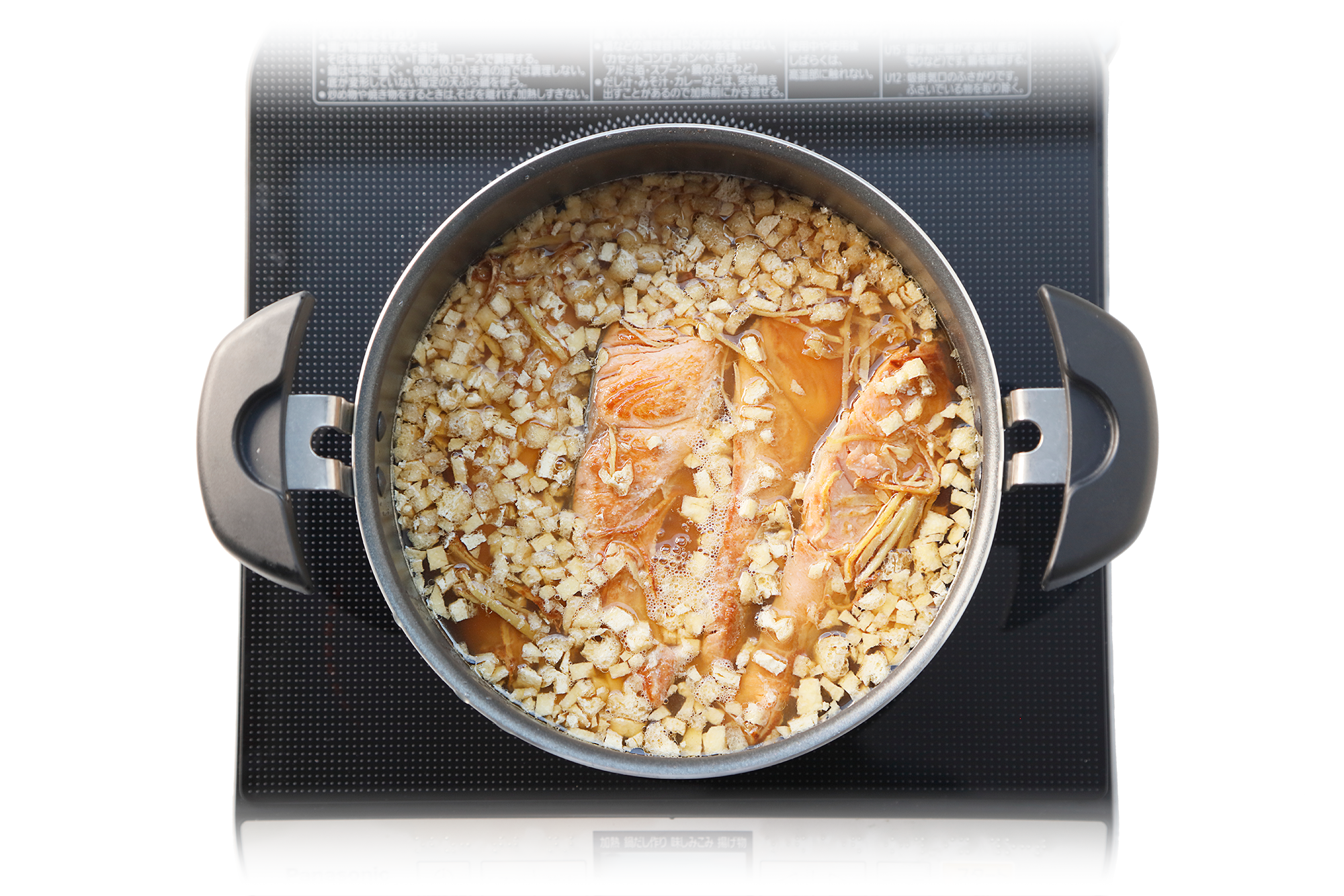 調理鍋に米、みじん切りの油揚げ、[材料A]、鮭を入れ、中火で加熱する。沸とうしたら火を弱めフタをして、8分加熱して火を止める。
