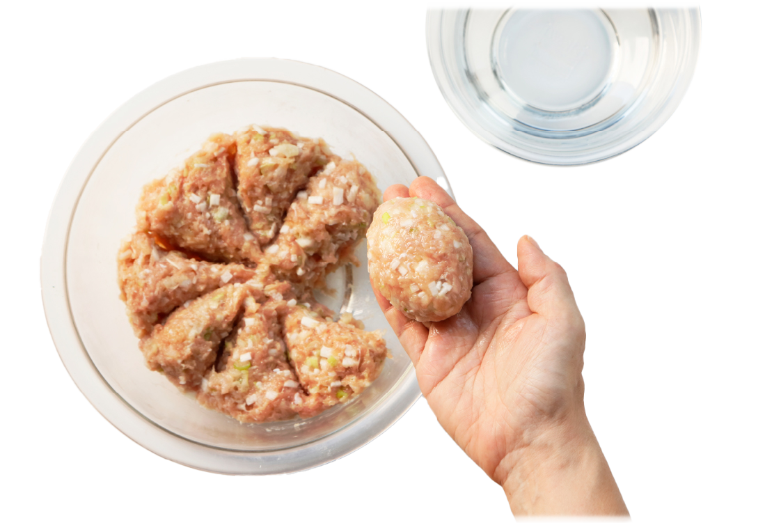 鶏ひき肉をしっかり練って粘りを出すことで崩れにくくなります。