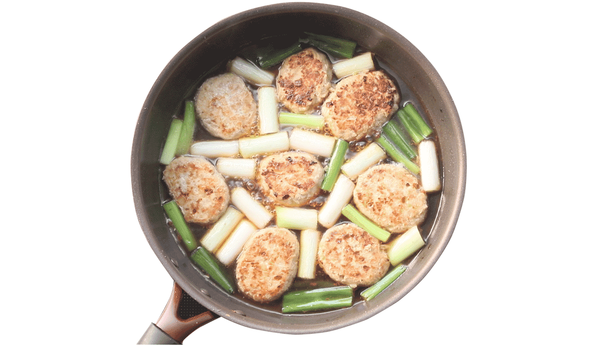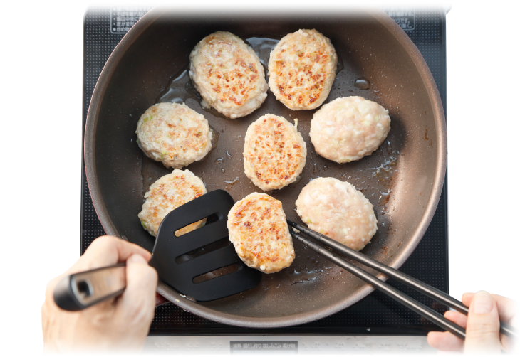 フライパンに太白油を入れて肉だねを並べる。点火して中弱火で焼き目が付くまで5分焼き、裏返してぶつ切りの長ねぎを加えてさらに5分焼く。