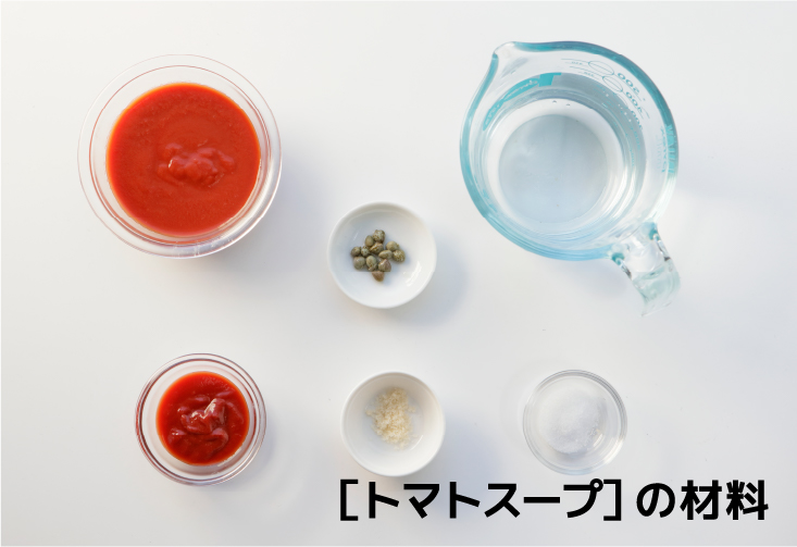 ボウルに[トマトスープ]の材料を入れてよく混ぜておく。にんにくはスライスして、赤唐辛子はへたを切り落とし、種を取り除く