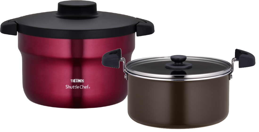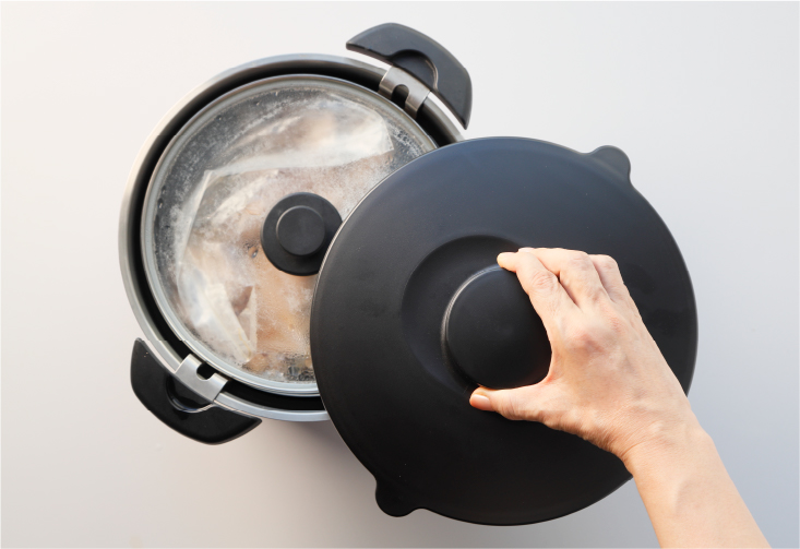 調理鍋を保温容器にセットし、【鶏ハムチャーシュー】は30分経ったら先に取り出す。【スモークチーズイン鶏ハム】は45分保温調理したら取り出す。