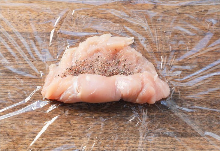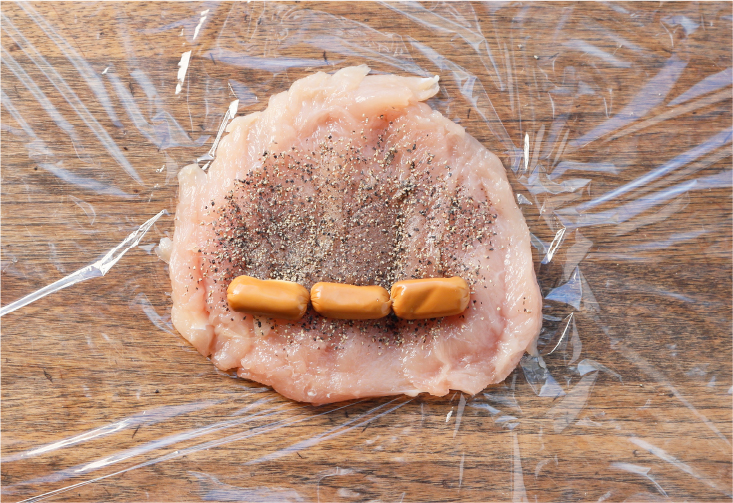 ❶を取り出して水気を拭く。粗挽き黒胡椒2gを一面にふる。肉の手前にスモークチーズを3個のせて手前からしっかりと巻く。